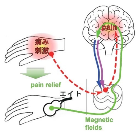 磁界照射によって、セロトニンとノルアドレナリンの分泌を促進し、下行性疼痛抑制系(痛みの伝達を抑制する神経系)が賦活化、痛みの感じ方が弱まります。