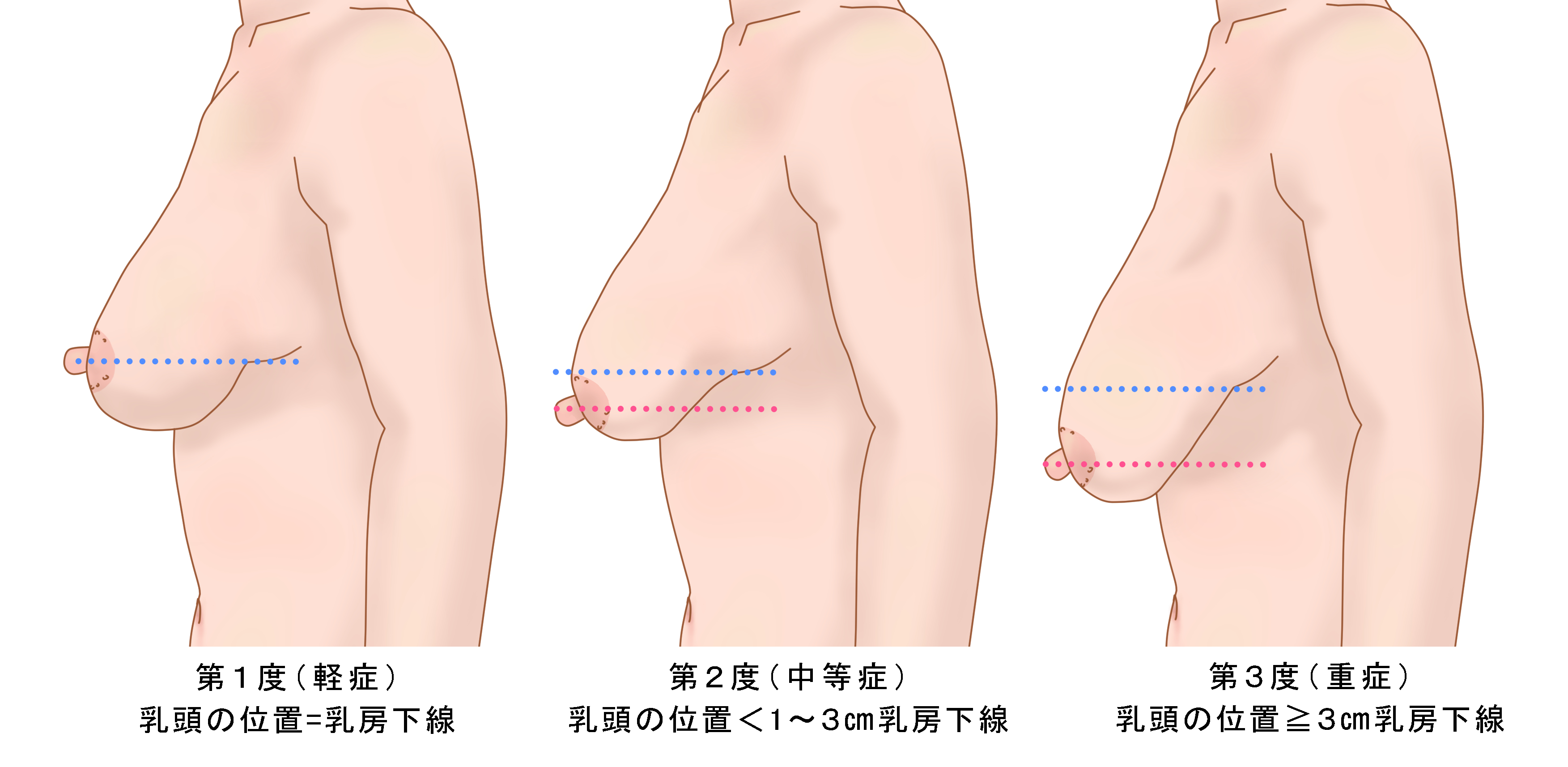 乳房下垂の分類にRegnault分類があり、乳頭の位置を基準として下垂の程度を評価します。