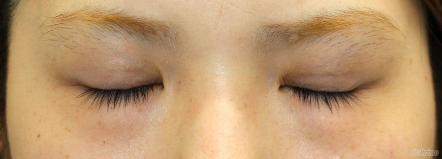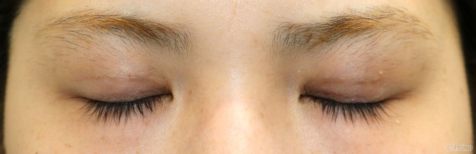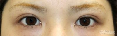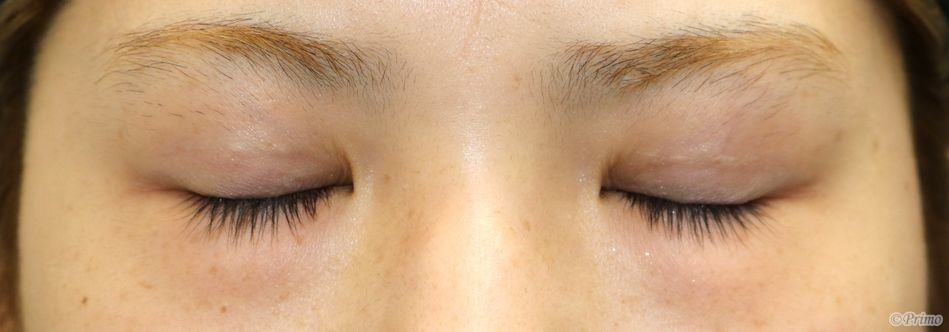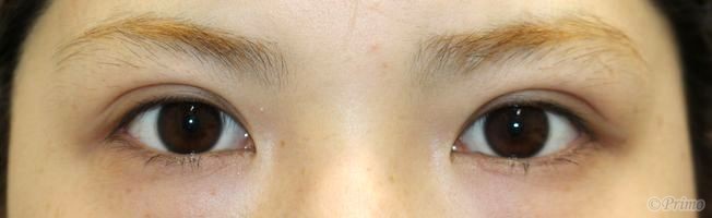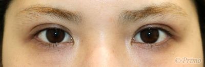 手術前の目元です。 左右差をなくして自然な平行型の二重にしたいというご希望から、 当院で二重埋没法6点固定を行いました。