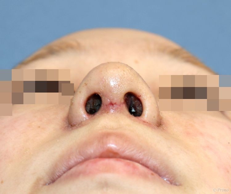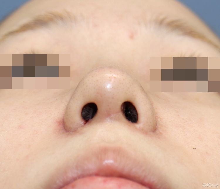 鼻翼縮小術(外側法)+鼻中隔延長術+鼻背部軟骨移植術+鼻尖縮小術後2週間の経過写真です。