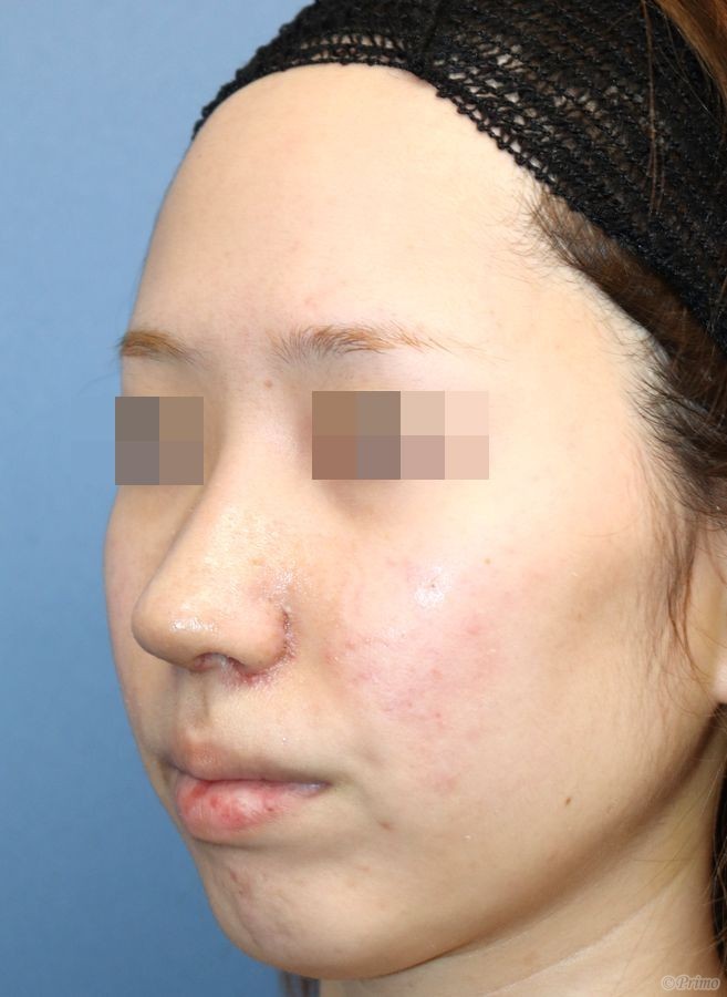 鼻翼縮小術(外側法)+鼻中隔延長術+鼻背部軟骨移植術+鼻尖縮小術後1週間の経過写真です。