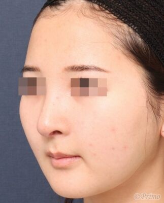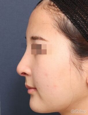鼻先が大きいのが気になり高さを出して控えめにしたい、小鼻をもっと小さくしたい、鼻筋を高くしたいというご要望から、当院で鼻中隔延長術+眉間プロテーゼを行いました。