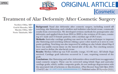 Plastic and Reconstructive Surgery Global Openに院長大場教弘医師の論文が掲載されました。 鼻翼縮小術後の修正や変形などを修復する鼻翼修正術について述べております。 鼻翼縮小術後の形にお悩みの方はお気軽にご相談下さい。