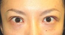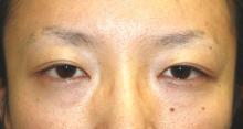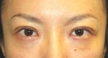 黒目が隠れ、まぶたが重く、眼瞼下垂の症状を呈しています。