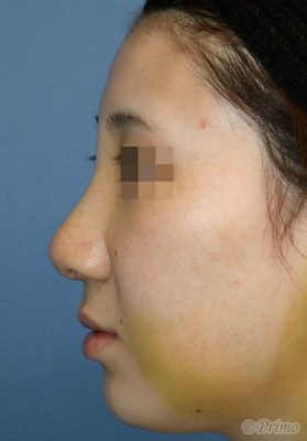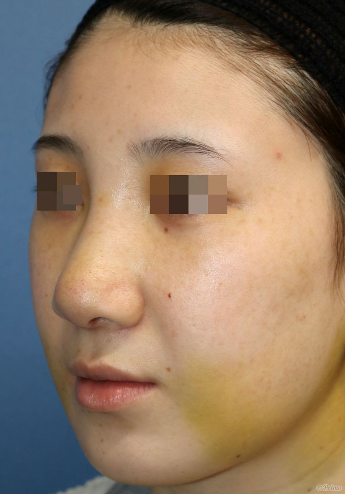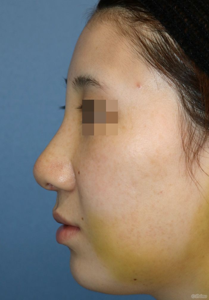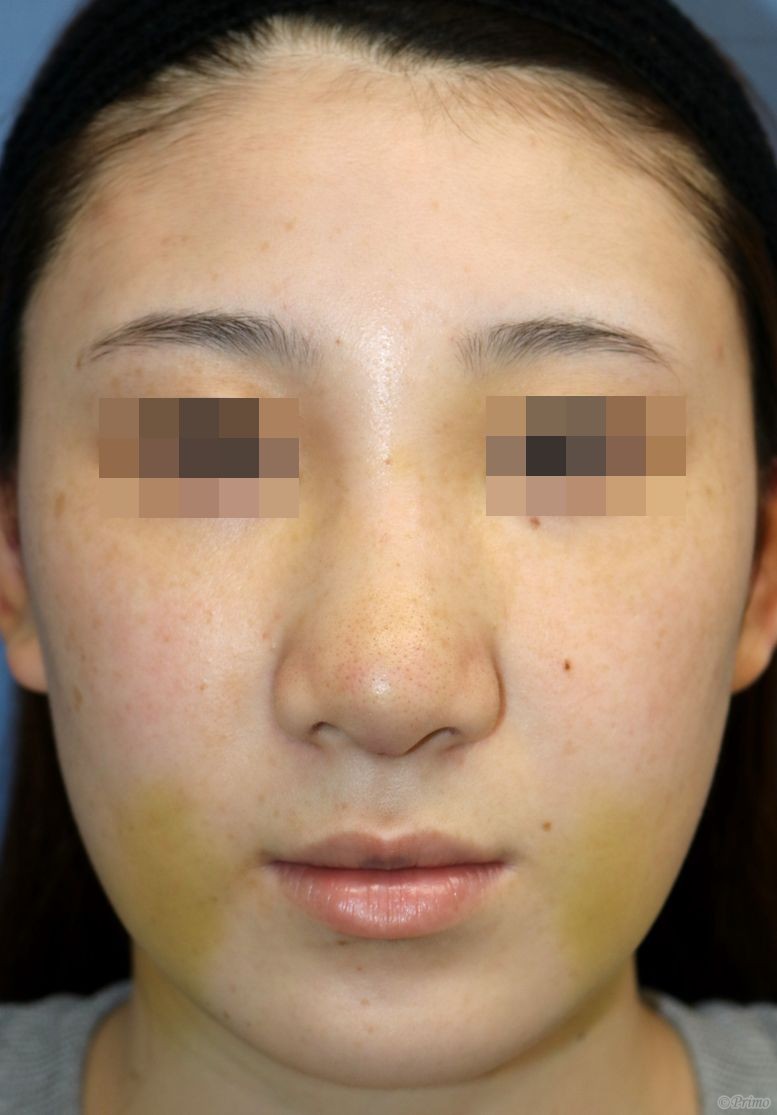 手術前の正面です。 術前は他院で入れたI型プロテーゼを別の院でL型プロテーゼに入れ替えを受けましたが、 L型プロテーゼが曲がって入ってしまいました。 鼻筋が曲がり、プロテーゼの輪郭がくっきりしすぎてしまいました。 当院で鼻中隔延長術+他院鼻プロテーゼ入れ替え術+眉間プロテーゼ手術を行いました。 鼻中隔延長術+他院鼻プロテーゼ入れ替え術+眉間プロテーゼ手術後1週間の経過写真です。 術後の腫れ、内出血がやや強くでています。 その影響でかなり大きな鼻に見えますが、術後経過とともにすっきりとしてきます。 手術前の斜めからです。 手術後1週間の斜めからです。 術後は鼻中隔延長術の効果で鼻先が下向きになりました。 手術前の横からです。 手術後1週間の横からです。 術前はやや鼻のスタートが高い位置すぎる印象で、 急に鼻が始まっていますが、 術後は緩やかなカーブを描き鼻背ラインにつながっています。 眉間プロテーゼの効果が出ていると思います。 これから腫れが引くとともにすっきりとした印象になっていきます。 ・費用(税別、麻酔代別) 鼻中隔延長術 ¥600,000 他院鼻プロテーゼ入れ替え術 ¥400,000 眉間プロテーゼ ¥300,000 他院修正術 ¥300,000 ・リスク・副作用(起こり得る可能性のあること) 腫れ、内出血、鼻出血、鼻づまり 鼻柱の傷跡 鼻先、耳介の知覚低下 鼻の傾き 鼻尖部の挙上ができない 鼻の形の左右差 プロテーゼの動揺 鼻中隔延長術 眉間プロテーゼ にほんブログ村 美容外科ブログランキングへ Tags:眉間プロテーゼ鼻プロテーゼ入れ替え術鼻中隔延長術