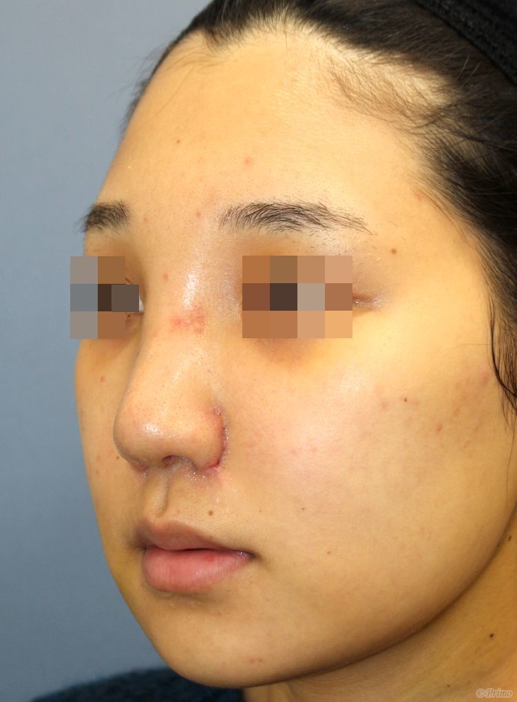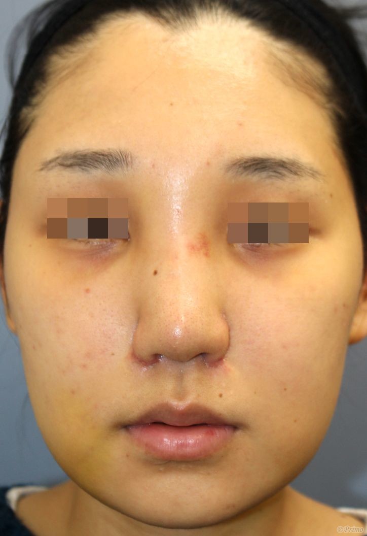 手術前の正面です。 術前は他院で鼻尖縮小術、鼻中隔延長術(鼻中隔軟骨移植術)、I型プロテーゼによる隆鼻術、鼻翼縮小術(小鼻縮小術)を受けていらっしゃいました。 鼻筋が曲がっている、小鼻の形を修正したい、鼻先も高くしたいなどのご希望から、当院で鼻翼修正術+他院鼻中隔延長術修正術+他院鼻プロテーゼ入れ替え術+眉間プロテーゼ手術を行いました。 鼻翼修正術+他院鼻中隔延長術修正術+他院鼻プロテーゼ入れ替え術+眉間プロテーゼ手術後1週間の経過写真です。 術後の腫れがまだある時期ですが、術後は鼻翼の幅が狭くなったのがわかります。 手術前の斜めからです。 手術後1週間の斜めからです。 手術前の横からです。 手術後1週間の横からです。 まだまだ腫れている時期ですが、術後は他院鼻中隔延長術修正術により鼻先の高さが高くなりました。 鼻柱口唇角も角度が改善しています。 手術前の下からです。 手術後1週間の下からです。 術後は鼻翼修正術によって鼻翼の丸みが形成されました。 他院鼻中隔延長術修正術によって鼻先の高さが高くなり小鼻の形態も改善しているのがわかります。 ・費用(税別、麻酔代別) 鼻翼修正術 ¥300,000 (組織の移動や移植を伴う複雑なもの) ¥500,000 鼻中隔延長術 ¥600,000 他院鼻プロテーゼ入れ替え術 ¥400,000 眉間プロテーゼ ¥300,000 他院修正術 ¥300,000 ・リスク・副作用(起こり得る可能性のあること) 腫れ、内出血、鼻出血、鼻づまり 鼻の知覚低下、傷跡 鼻の形の左右差 鼻翼部が丸く感じる 鼻翼部が厚くなる、硬くなる 鼻の傾き 鼻尖部の挙上ができない プロテーゼの動揺 鼻翼修正術 鼻中隔延長術 眉間プロテーゼ にほんブログ村 美容外科ブログランキングへ Tags:他院鼻プロテーゼ入れ替え術眉間プロテーゼ鼻中隔延長術鼻中隔延長術修正術鼻翼修正術