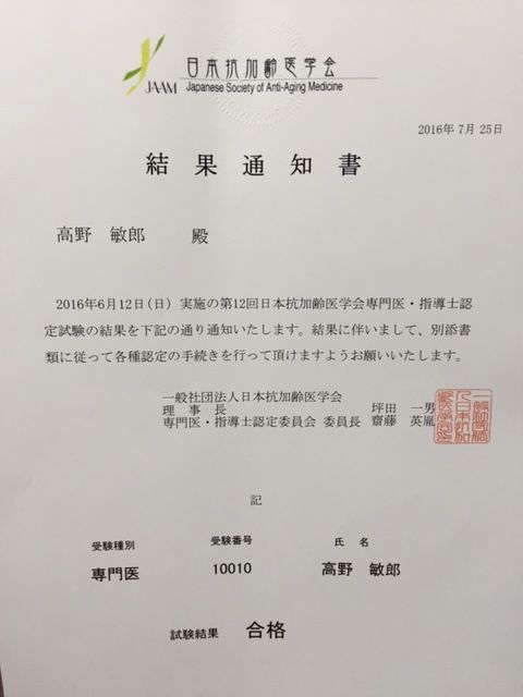 先月受験した抗加齢医学会の専門医試験の合格通知が届きました!