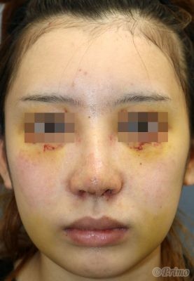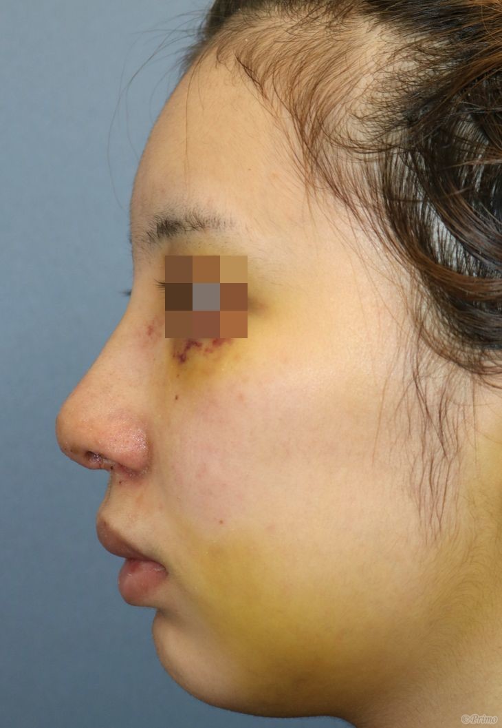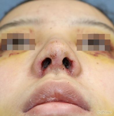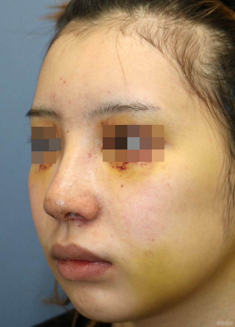 手術前の正面です。 術前は他院で団子鼻修正術、BNLS注射、ヒアルロン酸注入を受けていらっしゃいました。 鼻全体を高く細く、小鼻を小さくしたいという希望から、 整鼻術+鼻中隔延長術+鼻背部軟骨移植術+鼻翼縮小術(小鼻縮小術)内側法+鼻孔縁挙上術手術を行いました。 整鼻術+鼻中隔延長術+鼻背部軟骨移植術+鼻翼縮小術(小鼻縮小術)内側法+鼻孔縁挙上術手術後1週間の経過写真です。 術後は鼻筋がすっきりと通るようになりました。 術後1週間で内出血がまだ目立ちますが、徐々に落ち着いていきます。 手術前の斜めからです。 手術後1週間の斜めからです。 術後は鼻中隔延長術によって鼻柱が下り、鼻先が下向きに整いました。 手術前の横からです。 手術後1週間の横からです。 術後は鼻中隔延長術によって鼻先が下向きになり高くなりました。 顔全体のバランスが改善されています。 手術前の下からです。 手術後1週間の下からです。 鼻翼縮小術、鼻孔縁挙上術によって小鼻全体が小さくなりました。 内側法の傷跡が見えますが経過とともに目立たなくなります。 ・費用(税別、麻酔代別) 整鼻術 ¥600,000 鼻中隔延長術 ¥600,000 鼻背部軟骨移植術 ¥300,000 鼻翼縮小術(内側法) ¥300,000 鼻孔縁挙上術 ¥300,000 ・リスク・副作用(起こり得る可能性のあること) 腫れ、内出血、違和感 鼻出血、鼻づまり 鼻柱の傷跡 鼻先、耳介の知覚低下 鼻の傾き 鼻尖部の挙上ができない 鼻の段差、鼻の形の左右差 鼻尖部が丸く感じる 鼻翼が厚くなる 整鼻術 鼻中隔延長術 鼻翼縮小術 鼻孔縁挙上術 にほんブログ村 美容外科ブログランキングへ Tags:内側法整鼻術鼻中隔延長術鼻孔縁挙上術鼻翼縮小術鼻背部軟骨移植術