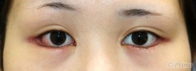 右側の方がつり目傾向が強く、下げ幅が大きかったため結膜浮腫がでていますが、これから徐々に軽快していきます。