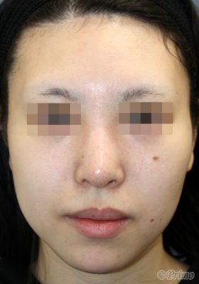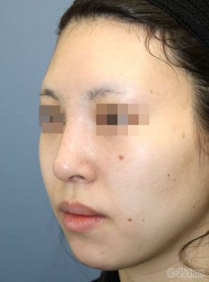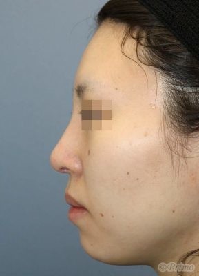 他院にてI型プロテーゼによる隆鼻術を受けていらっしゃいましたが、プロテーゼが右へ変位し曲がっていて動くことを修正したい、また、鼻先をバランス良く高くしたい、鼻筋もしっかり高くしたいとのご希望に対して、鼻中隔延長術+他院鼻プロテーゼ入れ替え術+眉間プロテーゼ挿入を行いました。