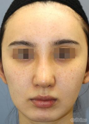 他院にてI型プロテーゼによる隆鼻術、鼻尖形成術を受けていらっしゃいましたが、鼻先をバランス良く高くしたい、鼻筋もできるだけ高くしたいとのご希望に対して、鼻中隔延長術+他院鼻プロテーゼ入れ替え術+眉間プロテーゼ挿入を行いました。