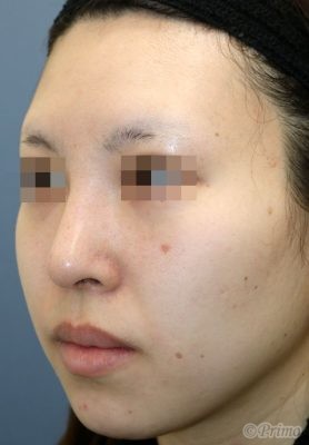 他院にてI型プロテーゼによる隆鼻術を受けていらっしゃいましたが、プロテーゼが右へ変位し曲がっていて動くことを修正したい、また、鼻先をバランス良く高くしたい、鼻筋もしっかり高くしたいとのご希望に対して、鼻中隔延長術+他院鼻プロテーゼ入れ替え術+眉間プロテーゼ挿入を行いました。