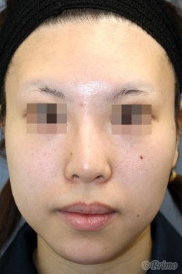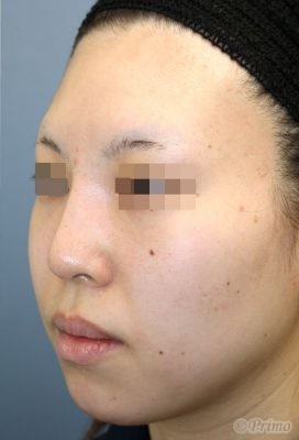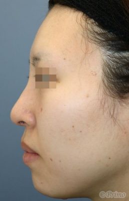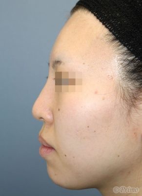 他院にてI型プロテーゼによる隆鼻術を受けていらっしゃいましたが、プロテーゼが右へ変位し曲がっていて動くことを修正したい、また、鼻先をバランス良く高くしたい、鼻筋もしっかり高くしたいとのご希望に対して、鼻中隔延長術+他院鼻プロテーゼ入れ替え術+眉間プロテーゼ挿入を行いました。