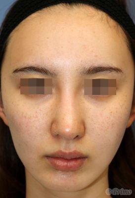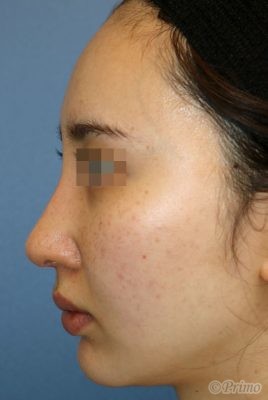 他院にてI型プロテーゼによる隆鼻術、鼻尖形成術を受けていらっしゃいましたが、鼻先をバランス良く高くしたい、鼻筋もできるだけ高くしたいとのご希望に対して、鼻中隔延長術+他院鼻プロテーゼ入れ替え術+眉間プロテーゼ挿入を行いました。