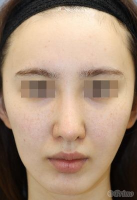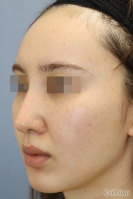他院にてI型プロテーゼによる隆鼻術、鼻尖形成術を受けていらっしゃいましたが、鼻先をバランス良く高くしたい、鼻筋もできるだけ高くしたいとのご希望に対して、鼻中隔延長術+他院鼻プロテーゼ入れ替え術+眉間プロテーゼ挿入を行いました