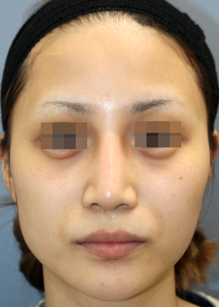 鼻中隔延長術+隆鼻術+眉間プロテーゼ手術、カルシウムハイドロキシアパタイト注入剤除去術後2ヶ月の経過写真です。