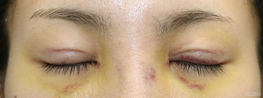 手術前の目元です。 術前は10年以上前に他院で埋没法を受けていらっしゃいました。 目の開きを改善し、目と目の幅も狭くしたいということで、 当院で眼瞼下垂手術+目頭切開手術を行いました。 眼瞼下垂手術+目頭切開手術後1週間の経過写真です。 make upなしです。 目の開きが改善し、ぱっちりとした目になりました。 目頭切開によって目と目の距離が近くなり、バランスが良くなりました。 まだ腫れや内出血が目立つ時期です。 術後1週間の目を閉じたところです。 ・費用(税別、麻酔代別) 眼瞼下垂手術 ¥600,000 目頭切開術 ¥250,000 ・リスク・副作用(起こり得る可能性のあること) 腫れ、内出血 瞼の違和感 睫毛側皮膚の知覚低下 埋没した吸収糸の露出 ラインの消失 瞼の形態の変化、顔の印象の変化 閉瞼不全、ドライアイ ヘリング現象 眼瞼下垂 目頭切開 にほんブログ村 美容外科ブログランキングへ Tags:目頭切開眼瞼下垂手術