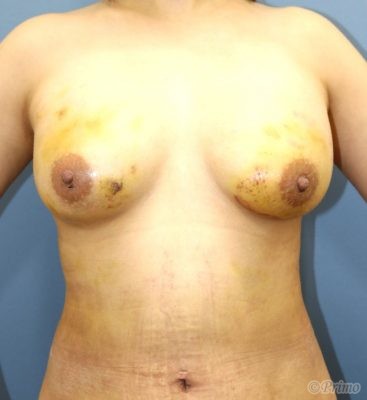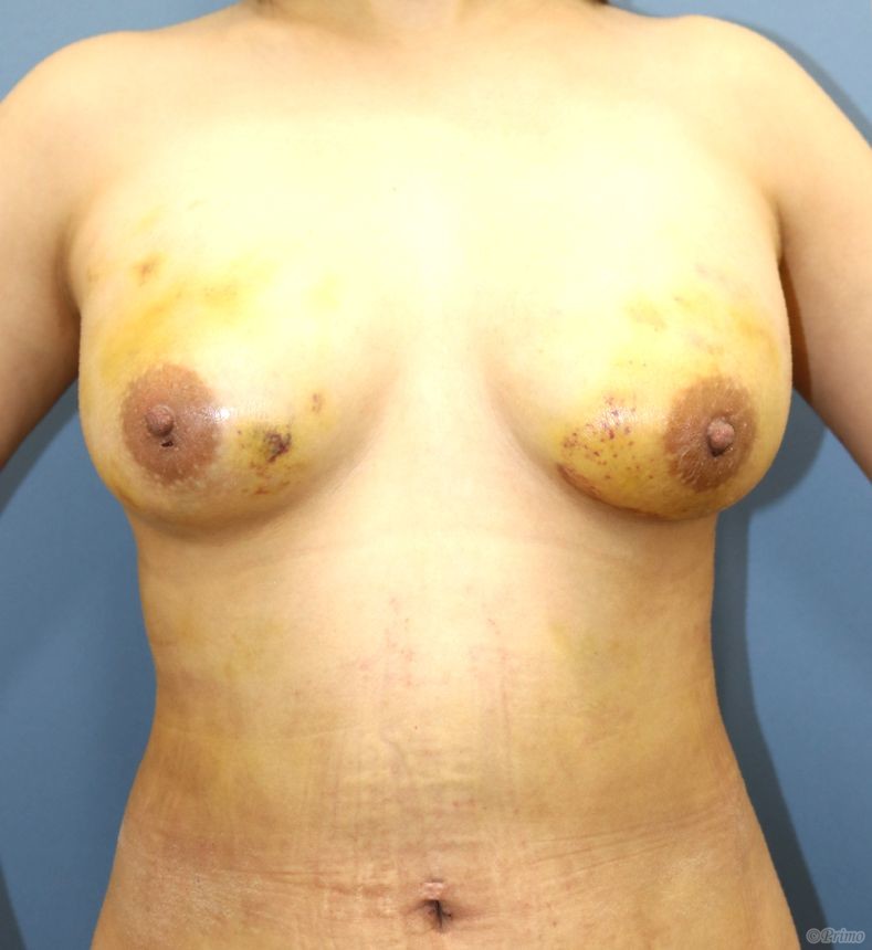 手術前の正面です。 半年前に当院でコンデンスリッチファット(CRF)脂肪注入による豊胸術を行い、 今回2回目の手術を行いました。 脂肪は全腹部と腰背部から吸引しています。 コンデンスリッチファット脂肪注入(CRF)による豊胸術2回目後1週間の経過写真です。 術後はバストが大きくなり、お腹の周りはすっきりしました。 内出血、腫れが出ていますが、徐々に落ち着いていきます。 手術前の斜めからです。 手術後1週間の斜めからです。 注入は乳頭直下およびわきの下から行っています。 手術前の横からです。 手術後1週間の横からです。 しっかりとボリュームアップしました。 ・費用(税別、麻酔代別) コンデンスリッチ豊胸術 ¥1,200,000 左目頭脂肪注入 ¥50,000 腰背部脂肪吸引 ¥300,000 ・リスク・副作用(起こり得る可能性のあること) 腫れ、内出血、痛み 傷跡 皮膚の張りの減少 貧血 吸引部位の知覚低下 色素沈着 しこりの形成、脂肪壊死 肥厚性瘢痕 左右差 コンデンスリッチ豊胸術 にほんブログ村 美容外科ブログランキングへ Tags:コンデンスリッチ豊胸術