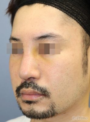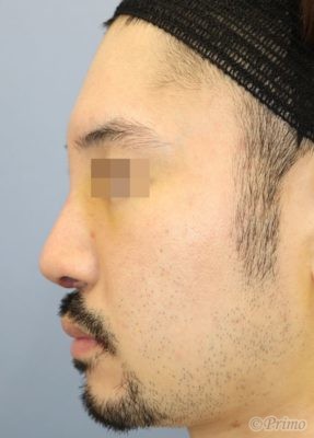 他院でアクアミドを繰り返し注入され、少し不自然に太くなってしまったので、アクアミドを除去し、また鼻筋を通しながら鼻先も高くしたいとのご希望で、鼻中隔延長術+隆鼻+眉間プロテーゼ手術を施行しました。