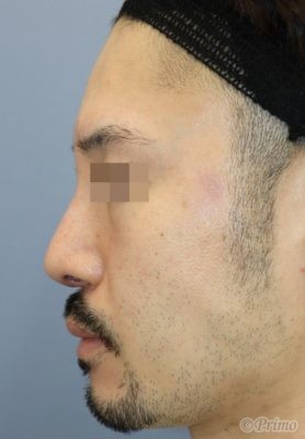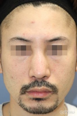 他院でアクアミドを繰り返し注入され、少し不自然に太くなってしまったので、アクアミドを除去し、また鼻筋を通しながら鼻先も高くしたいとのご希望で、鼻中隔延長術+隆鼻+眉間プロテーゼ手術を施行しました。