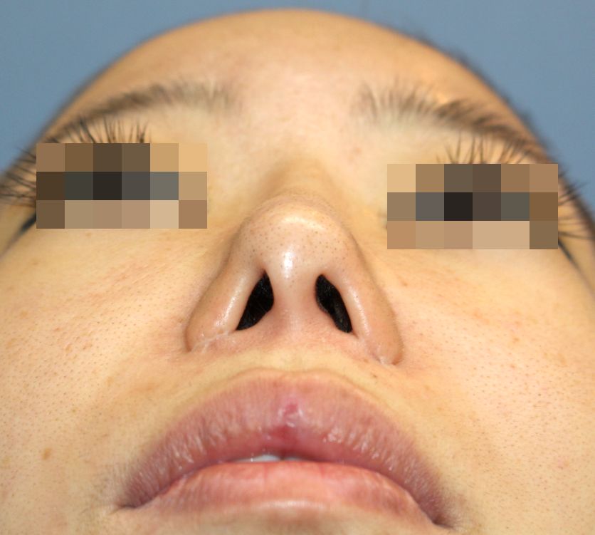鼻筋が細すぎる、鼻先は上向き、小鼻が不自然なところを修正したい、鼻を全体的にもう少し自然に整えたいという希望から、当院で鼻翼修正術、鼻中隔延長術(肋軟骨)、他院鼻プロテーゼ入れ替え術、眉間プロテーゼ手術を行いました。