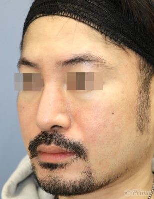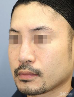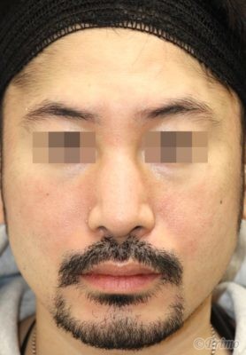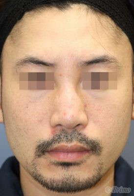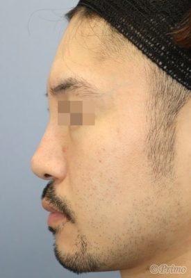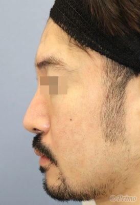 他院でアクアミドを繰り返し注入され、少し不自然に太くなってしまったので、アクアミドを除去し、また鼻筋を通しながら鼻先も高くしたいとのご希望で、鼻中隔延長術+隆鼻+眉間プロテーゼ手術を施行しました。