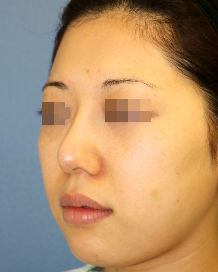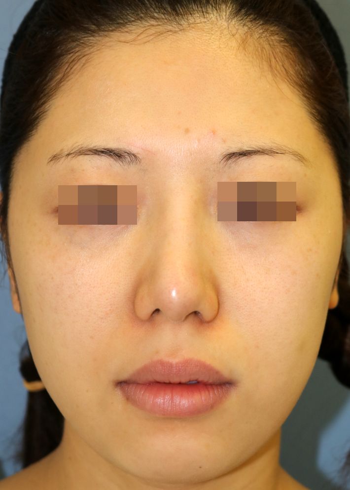 術前は他院で鼻中隔延長術、鼻プロテーゼ、鼻尖縮小術を受けていらっしゃいましたが、プロテーゼが曲がっている点、鼻根部にプロテーゼの輪郭が分かるため眉間にもプロテーゼを入れたくなった、現状不自然でバレやすいので自然に形成したいという希望から、
