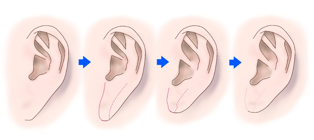 局所麻酔あるいは静脈麻酔を行ったうえ手術をおこないます。変形している耳垂を前回の手術の縫合部で切開します。単純に縫合すると、再発しますので、頬側の皮下を剥離し、作成した皮弁を耳介軟骨にしっかりと引き上げ縫合固定し、耳垂の形態を整えます。