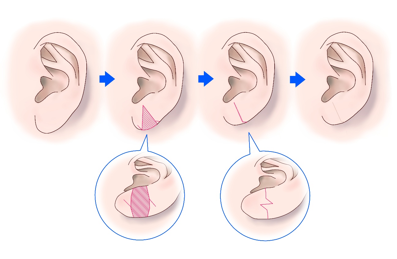 局所麻酔下あるいは静脈麻酔下に耳垂基部やイラストのように最適な部分で余剰組織を切除します。この際に辺縁にZ形成術を用いることでより自然な耳垂形態を保つことが可能です。これを行わないとnotchingが生じ違和感のある耳垂になる可能性があります。