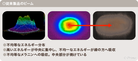 従来製品のレーザービームは照射部位に対し、中心部のエネルギーが最も高く、外側になるほど弱く照射されます。(ガウシアンモード)