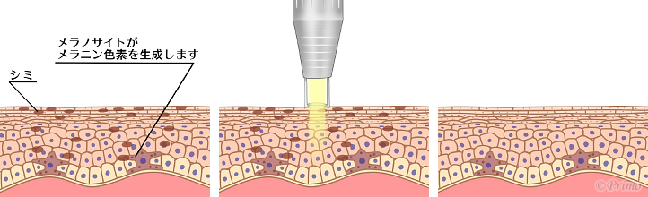 弱いパワーで照射されたレーザーはメラニン色素に穏やかに作用し、周囲の組織にダメージを与えることなくメラニンを選択的に破壊します。