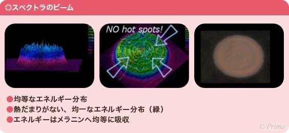 少ないエネルギーで皮膚への過剰な熱ダメージを与えることなくメラニン色素を安全に破壊します。