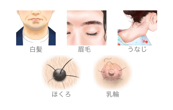レーザー脱毛では処理が難しい白髪や細毛、レーザーにより硬毛化した毛、ホクロ、乳輪など色素が濃くレーザーが照射できない部位などあらゆる毛質に対応でき、レーザー脱毛より確実な効果が得られます。