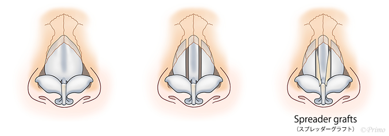 鼻が曲がっているのを治したがまだ曲がりが気になる場合、鼻中隔軟骨の傾きや方向が原因であることがしばしばあります。鼻中隔矯正術を行い、可能な限りまっすぐな状態に形成いたします。斜鼻によって鼻閉が起きている場合には、下鼻甲介粘膜下骨切除術をおこなったり、spreader graft手術を同時に用いるなどで鼻腔を広げるように形成いたします。