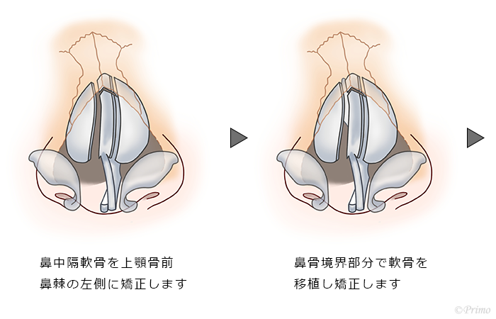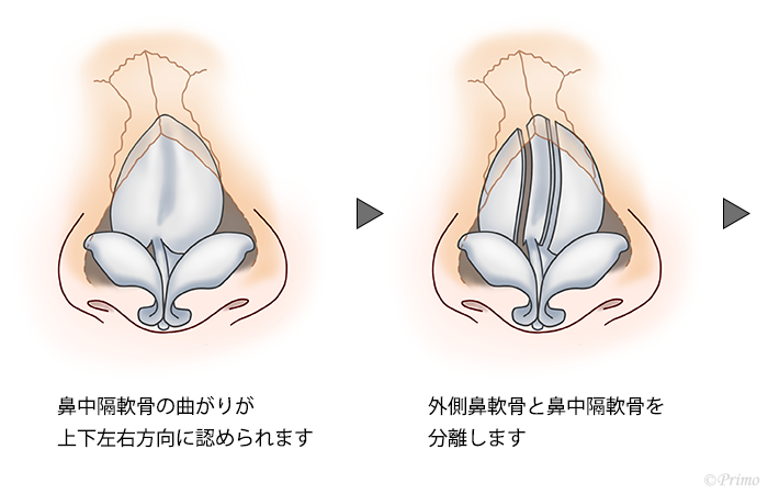 鼻中隔軟骨の湾曲している部分を切除または削り、鼻中隔が真っ直ぐになるように調整します。 層々縫合で閉創いたします。