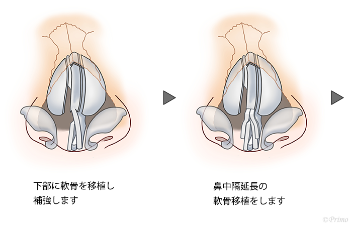 鼻先の高さを得るために鼻中隔延長術を行います。延長する軟骨は耳介軟骨や肋軟骨を用います。鼻中隔延長術は鼻中隔矯正術と、多くの場合に併用される術式です。