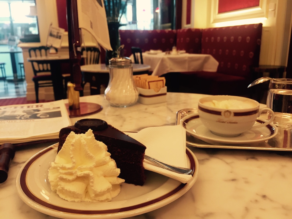 最後の朝に一人ホテルザッハーでザッハトルテとウィンナーコーヒーをいただきました